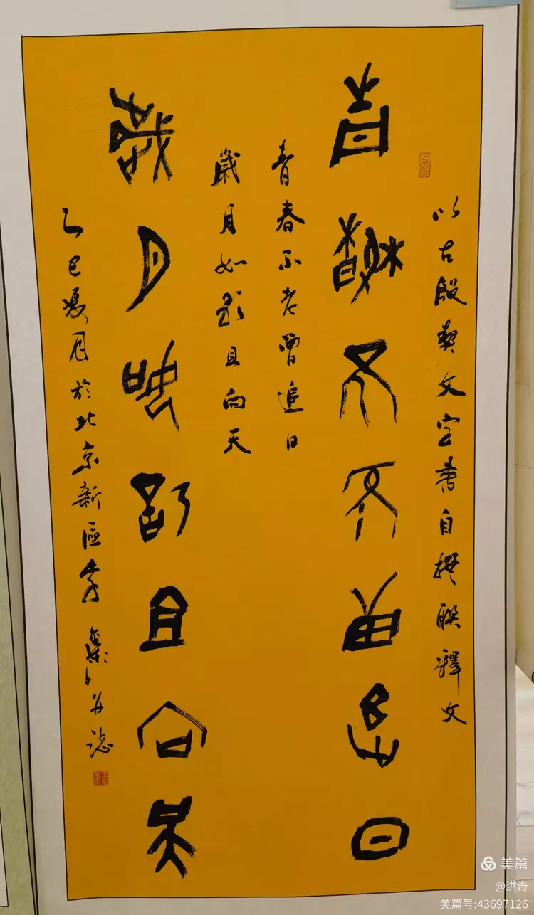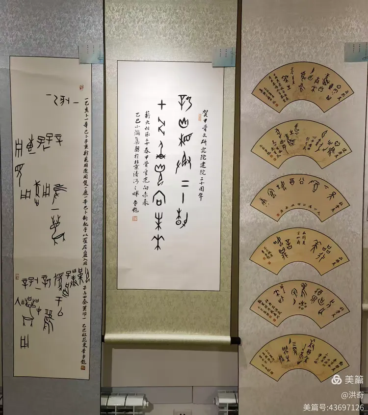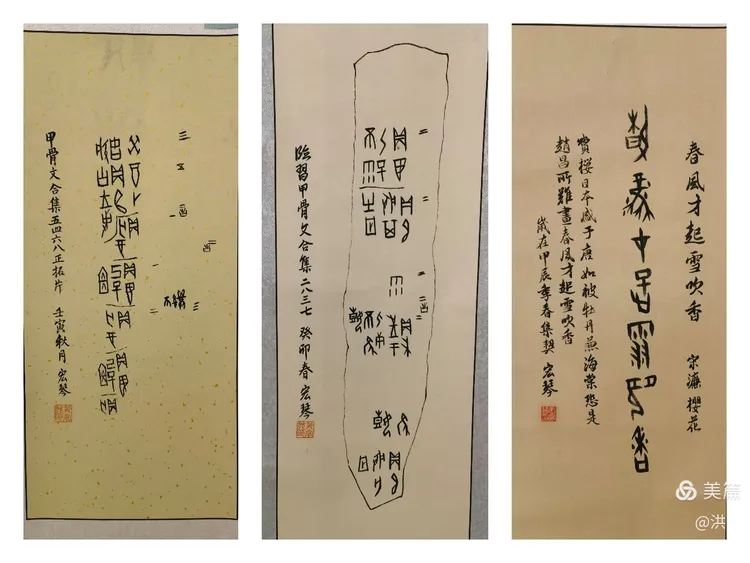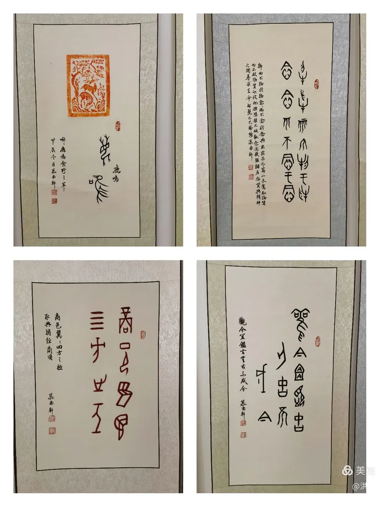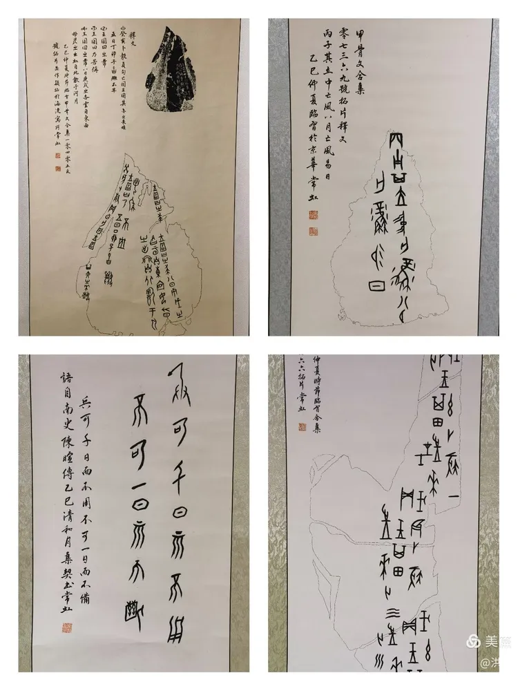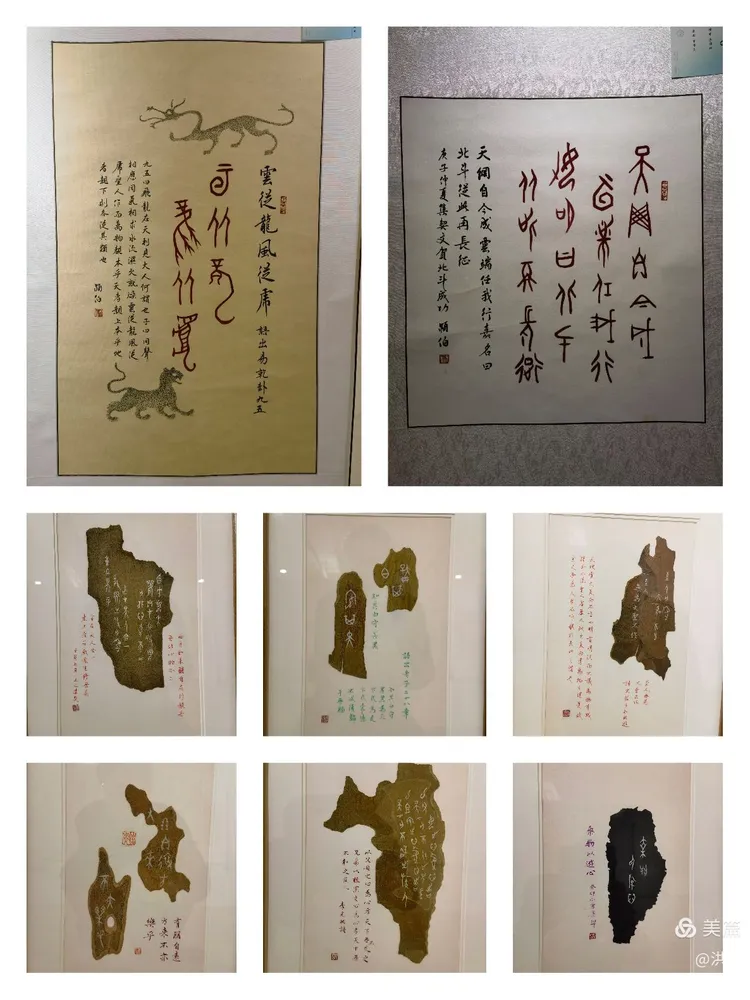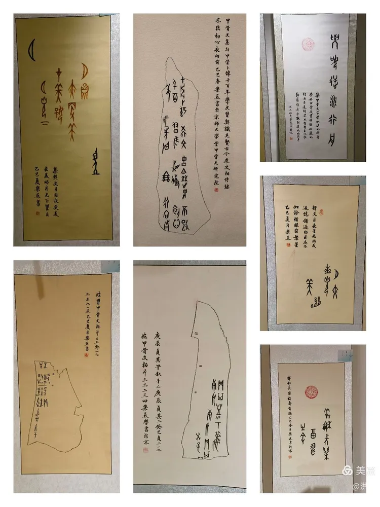 这些参展作品不仅为各界嘉宾与师生搭建起一座跨越三千年的文明对话桥梁,更是助力中华优秀传统文化国际传播的鲜活载体,展示了传统文化在新时代的蓬勃生命力。这次参与创作的作者怀着敬畏殷契、敬畏祖先、敬畏先贤、敬畏优秀文化的心态,在努力追求甲骨文契刻美、原始美、自然美的同时,在笔法、墨法、章法、使用材料等方面进行大胆探索创新,给人以耳目一新之感,使古老神秘的甲骨文焕发勃勃生机。