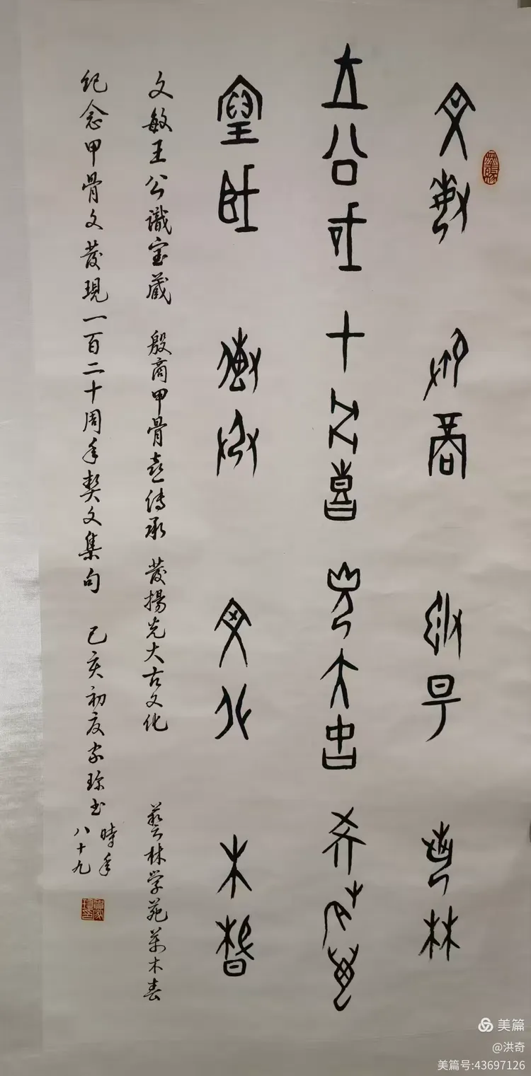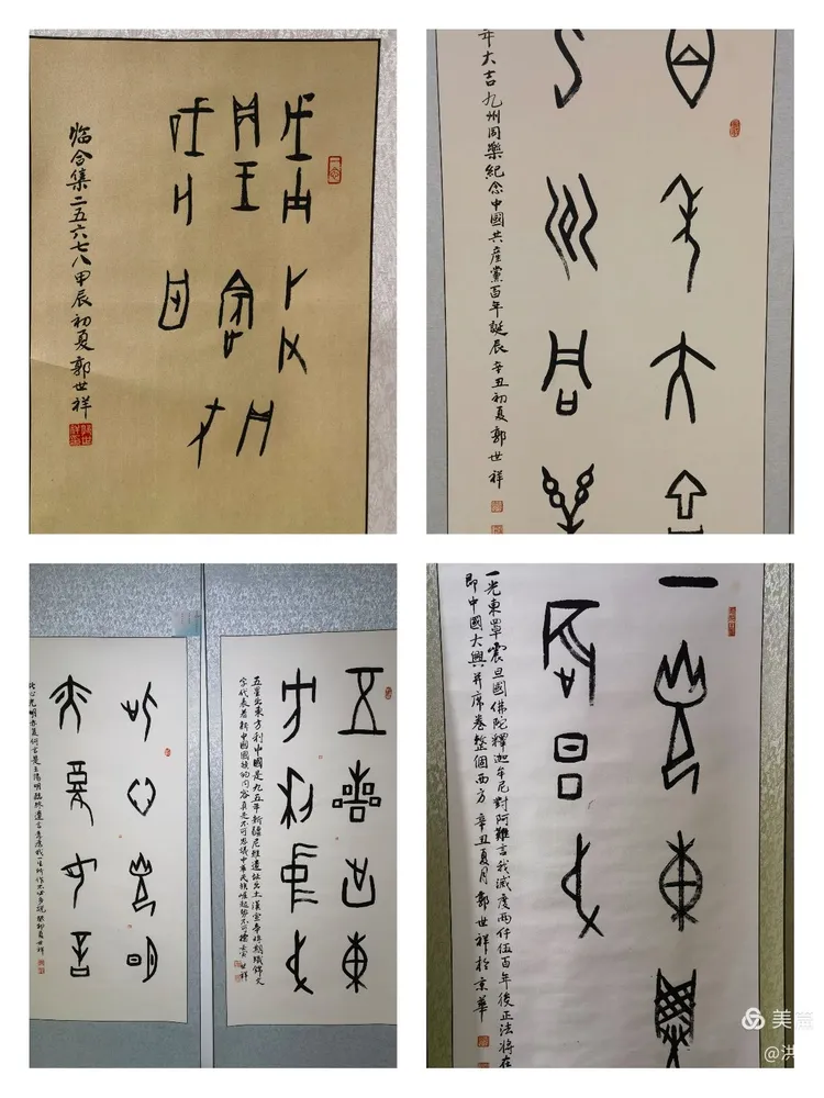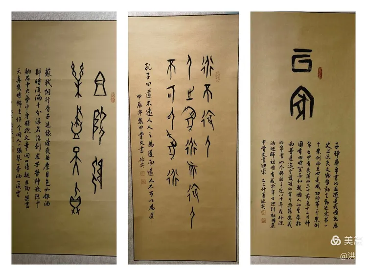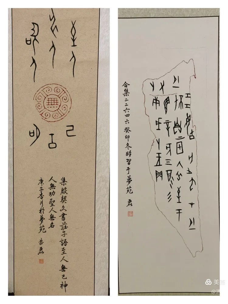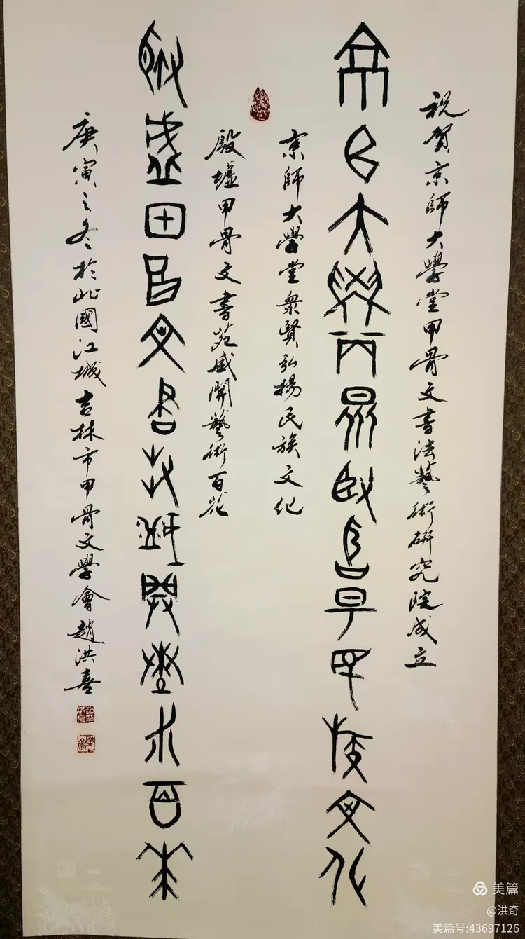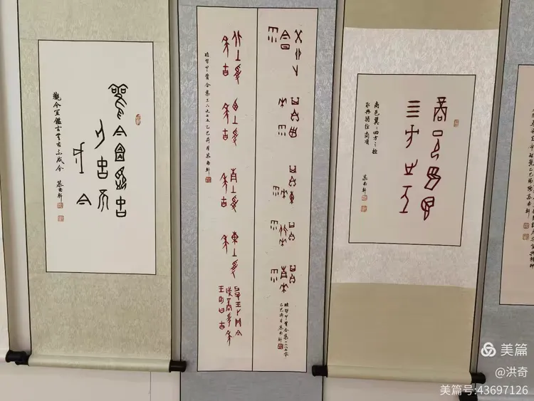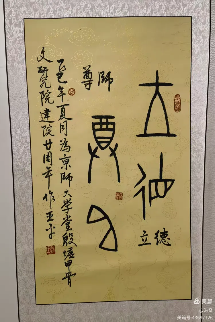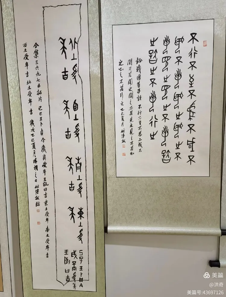 这些参展作品不仅为各界嘉宾与师生搭建起一座跨越三千年的文明对话桥梁,更是助力中华优秀传统文化国际传播的鲜活载体,展示了传统文化在新时代的蓬勃生命力。这次参与创作的作者怀着敬畏殷契、敬畏祖先、敬畏先贤、敬畏优秀文化的心态,在努力追求甲骨文契刻美、原始美、自然美的同时,在笔法、墨法、章法、使用材料等方面进行大胆探索创新,给人以耳目一新之感,使古老神秘的甲骨文焕发勃勃生机。